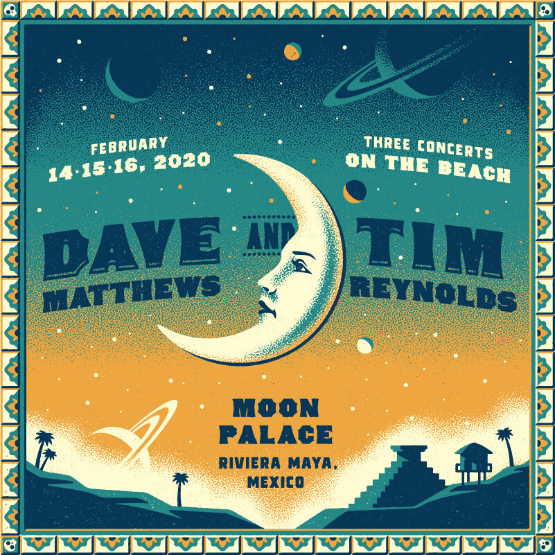 Every year Dave Matthews and Tim Reynolds make their way to Mexico for a series of concerts, and for 2020 we had the pleasure of creating the branding for the shows. Taking place at Moon Palace in Riviera Maya, Mexico, we took the name of the resort quite literally, featuring an illustrated man in the moon as the key element of the branding, accompanied by a spacescape along with Mayan architecture and the Riviera Maya landscape below. To give the illustration a hint of a distressed ceramic tile feel, we included some texture and stippled effect for a more organic look.