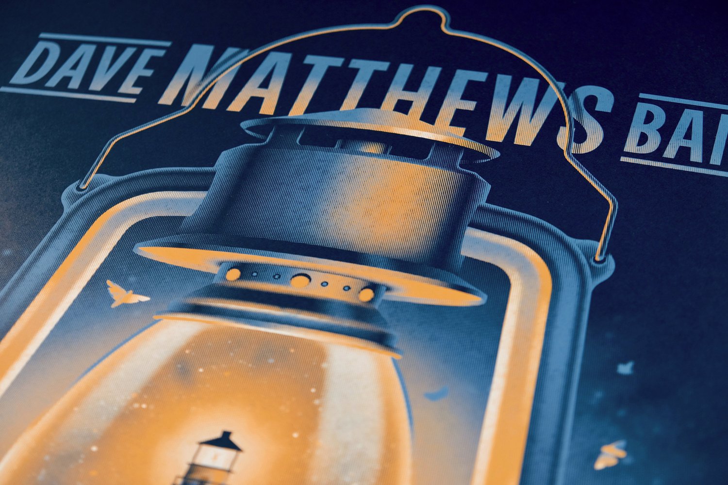 As Dave Matthews Band wraps up another year of touring, we were excited to take on another gig poster for the band, this time for their show in Boston, Massachusetts. We were inspired by a cold winter night on the Boston Harbor, lit by the famous Boston Light lighthouse, and we contained the whole scene in a classic camping lantern, complete with moths buzzing around the flame.