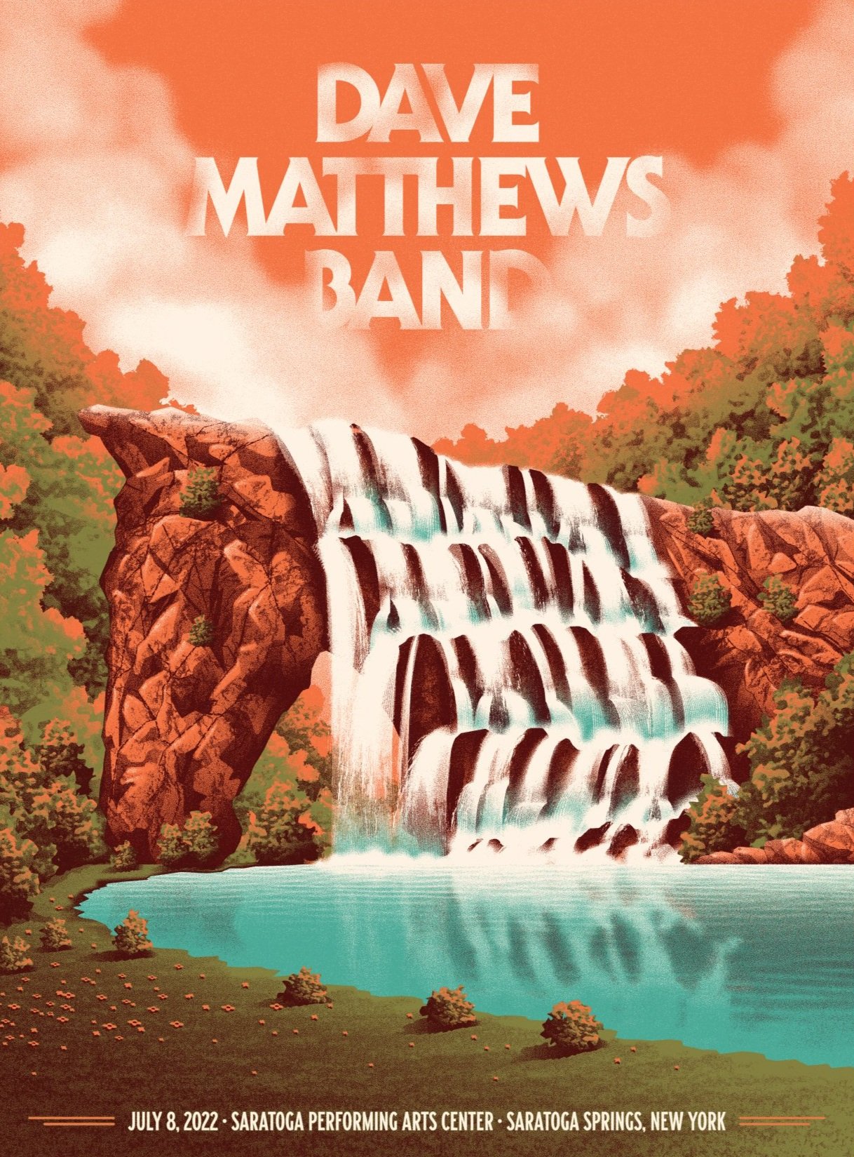For Dave Matthews Band’s stop in Saratoga Springs, New York, we were inspired by the beautiful scenery in the region, including the namesake natural springs. But in our version of the springs flowing through the rocky landscape, there’s more than meets the eye. Similarly inspired by the history of horse racing in the area, keen observers will notice that the waterfalls in the poster double as the flowing mane of a horse’s silhouette hidden among the rocks.