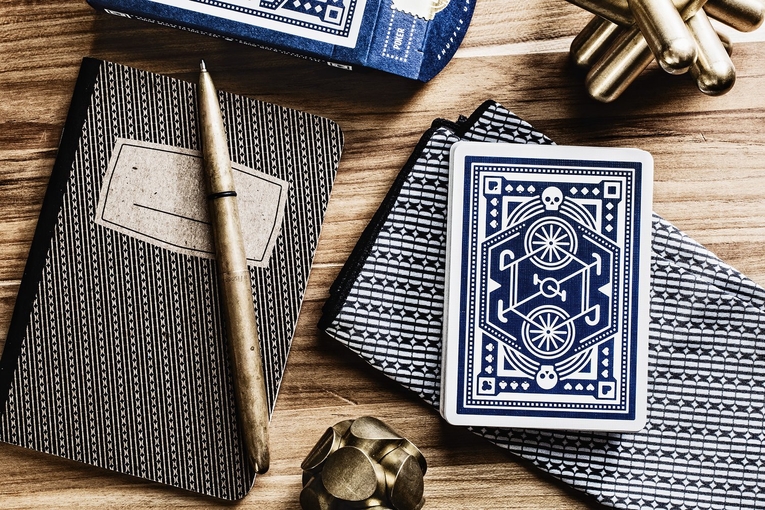 The much anticipated followup to our first deck of Red Wheel Playing Cards is now here! Blue Wheel Playing Cards are the same great quality, manufactured by the United States Playing Card Company, and with a fresh new color palette. With the help of our friends Dan & Dave at Art of Play, we designed a completely original deck from the tuck case to the face cards and everything in between, now available in your choice of red or blue. The tuck case includes an embossed foil stamp on thick blue paper and each card is printed with two metallic inks. These are standard Poker size playing cards with an air-cushion finish, just like the Bicycle cards you’re used to from the U.S. Playing Card Co. Check out closeup images of the cards below. ‘Blue Wheel’ decks are now available in the DKNG Store.