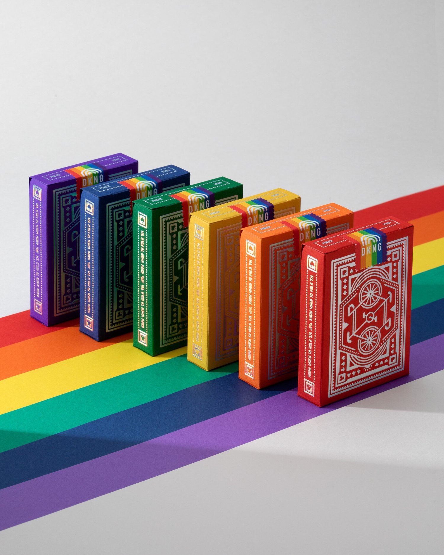 Celebrate your pride with DKNG 'Rainbow Wheel' playing cards, produced by Art of Play. This limited edition release packs a colorful punch of six new tuck cases representing every color of the rainbow! Each tuck case is printed with a vibrant holographic foil stamped embossment. Every deck inside is identical, all featuring a brand new rainbow inspired color scheme, along with a metallic rainbow foil back design.