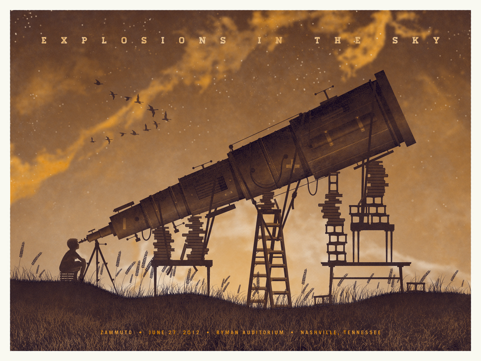 We are very excited to announce our third poster design created for Explosions In The Sky. The 24"x18" two color screen print has an edition of 130 and will be available in our online store starting June 28th, the day after the show. We have a very limited allotment of prints so be sure to act fast on this one.