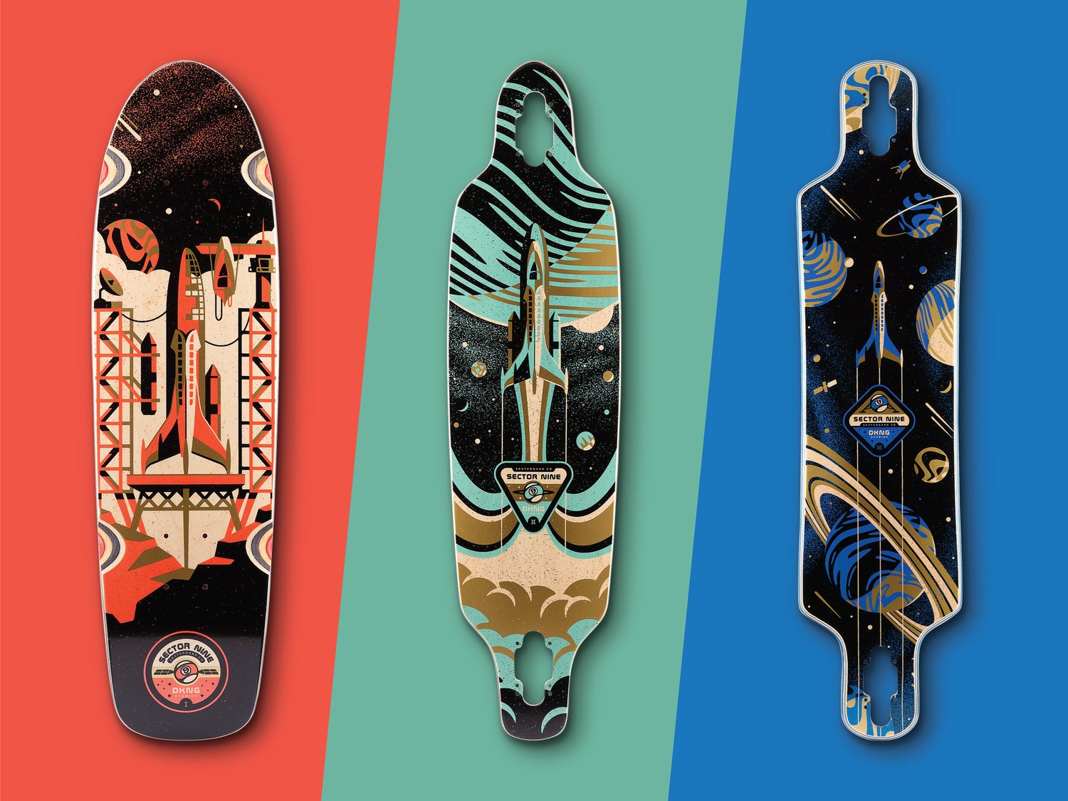 The new space travel themed series of DKNG decks and completes includes three different designs - “Launch” a 28” kicktail cruiser, “Navigate” a 34” cruiser, and “Encounter” a 38” freeride longboard. Each multi-ply maple deck includes gold foil highlights and die-cut grip tape. And the complete boards include Gullwing trucks and Nineballs wheel, all in custom colors to match the series.