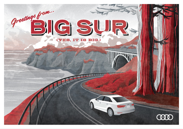 At this year's San Francisco Auto Show, Audi unveiled the latest model of its iconic A3, now available for the first time as a sedan. Leading up to the auto show, we worked with Audi to create a series of digital postcards that were sent from the A3 itself as it made its way up the California coast on its way to San Francisco. The postcards were sent from Big Sur, Pebble Beach, and Santa Cruz, each featuring the A3 making its way through the California scenery. Check out the finished postcards above and the email version, sketches, and photo of the new A3 below.
